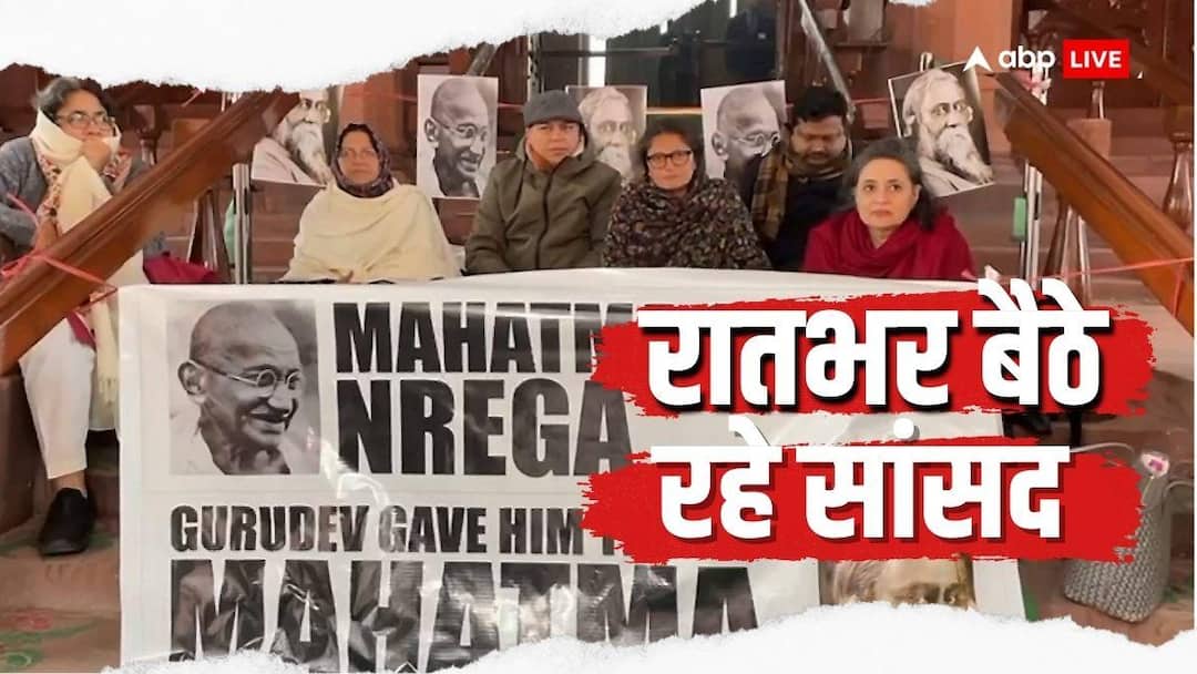 विपक्षी सांसदों ने महात्मा गांधी राष्ट्रीय ग्रामीण रोजगार गारंटी अधिनियम (मनरेगा) के स्थान पर ‘विकसित भारत- जी राम जी विधेयक’ पारित किए जाने के खिलाफ संसद परिसर में बृहस्पतिवार (18 दिसंबर 2025) रात से शुक्रवार सुबह तक 12 घंटे का धरना दिया. विपक्षी दलों के सांसदों ने यह ऐलान भी किया कि सरकार के इस कदम का संसद में पुरजोर विरोध करने के बाद अब वे सड़कों पर उतरेंगे. संसद ने बृहस्पतिवार (18 दिसंबर 2025) को ‘विकसित भारत- जी राम जी विधेयक, 2025’ को मंजूरी दी. पहले दिन में यह विधेयक लोकसभा और देर रात राज्यसभा से पारित किया गया. तृणमूल कांग्रेस की सांसद सागरिका घोष ने आरोप लगाया कि मोदी सरकार जिस तरह से यह पूरी तरह से 'गरीब-विरोधी, जन-विरोधी, किसान-विरोधी और ग्रामीण गरीबों के खिलाफ' विधेयक लाई और मनरेगा को खत्म कर दिया है, वह निंदनीय है. उन्होंने कहा, 'यह भारत के गरीबों का अपमान है, यह महात्मा गांधी