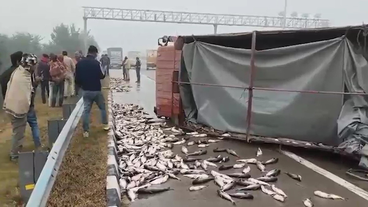 UP: मछलियों से भरा कैंटर पलटा तो लूटने लगे लोग, पूरा हाईवे हो गया जाम- VIDEO