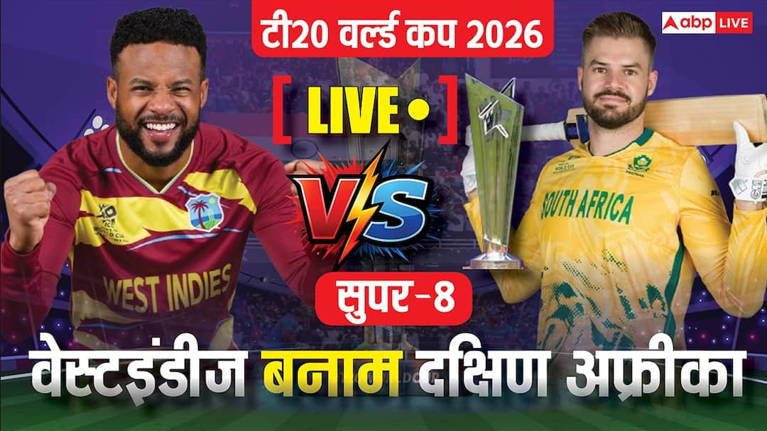 टी20 वर्ल्ड कप 2026 में आज पहला मैच वेस्टइंडीज और दक्षिण अफ्रीका के बीच नरेंद्र मोदी क्रिकेट स्टेडियम में खेला जा रहा है. इस मैच पर टीम इंडिया की भी नजर टिकी है, क्योंकि इसका नतीजा ही टूर्नामेंट में भारत का भविष्य तय करेगा. भारत चाहेगा कि दक्षिण अफ्रीका जीत जाए. टॉस जीतकर दक्षिण अफ्रीका ने पहले गेंदबाजी करने का फैसला किया है. दक्षिण अफ्रीका की प्लेइंग 11 एडन मार्क्रम (कप्तान), क्विंटन डी कॉक (विकेटकीपर), रयान रिकेल्टन, डेवाल्ड ब्रेविस, डेविड मिलर, ट्रिस्टन स्टब्स, मार्को जेनसन, कॉर्बिन बॉश, केशव महाराज, कगिसो रबाडा, लुंगी एनगिडी. वेस्टइंडीज की प्लेइंग 11 ब्रैंडन किंग, शाई होप (कप्तान और विकेटकीपर), शिमरन हेटमायर, रोवमैन पॉवेल, शेरफेन रदरफोर्ड, रोस्टन चेस, रोमारियो शेफर्ड, जेसन होल्डर, मैथ्यू फोर्ड, गुडाकेश मोटी, शमर जोसेफ. टी20 वर्ल्ड कप में आज होने वाला वेस्टइंडीज बनाम दक्षिण अफ्रीका मैच बहुत महत्वपूर्ण है, क्योंकि अगर वेस्टइंडीज जीती तो भारत के चांस सेमीफाइनल में जाने के बहुत कम